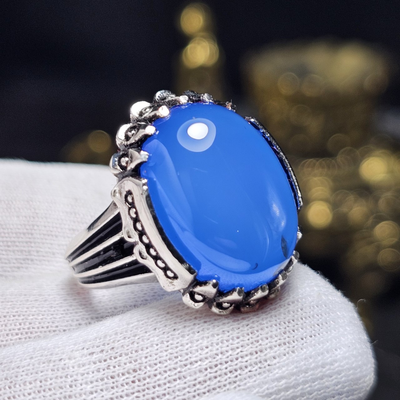انگشتر نقره روس با سنگ عقیق آبی معدنی کد : 37027