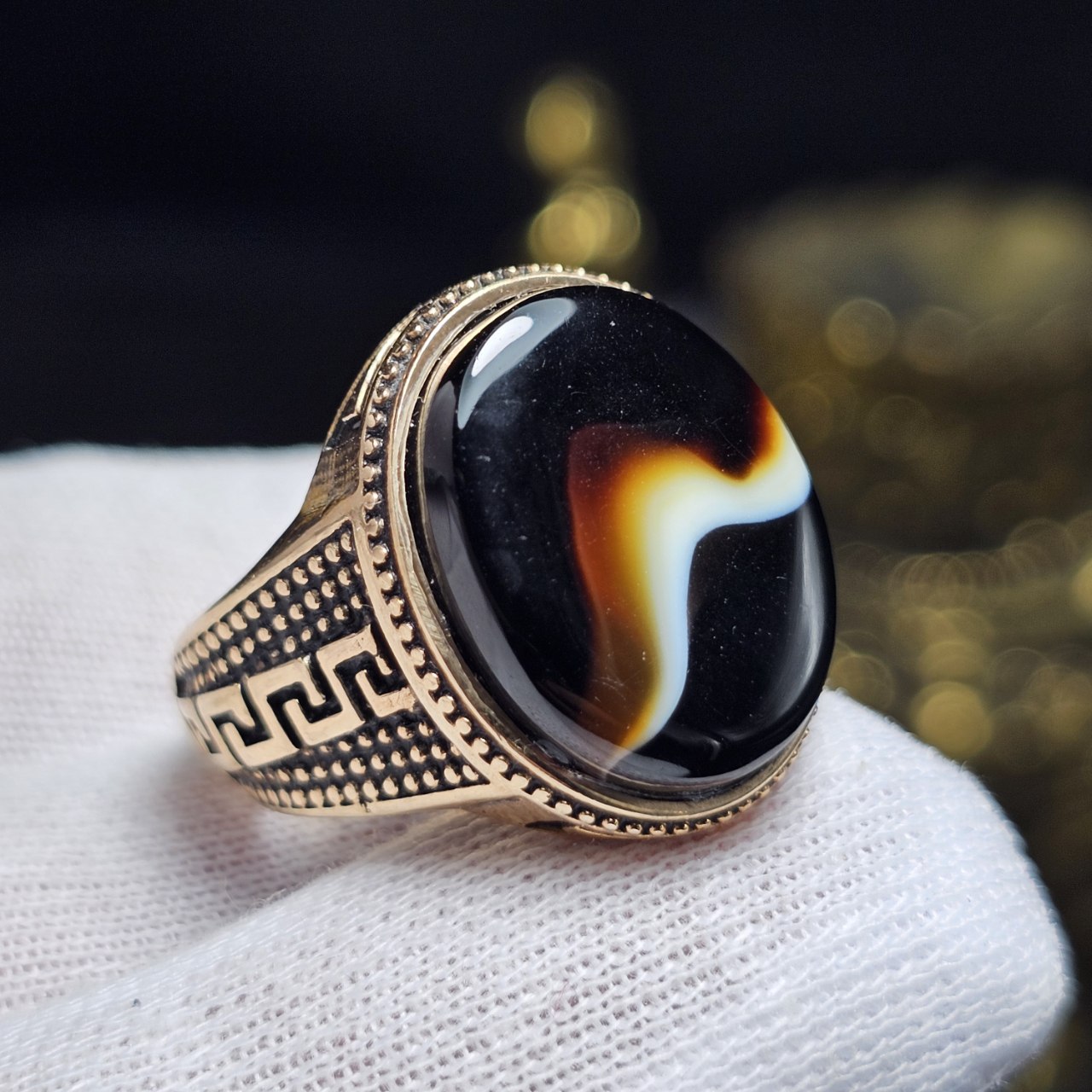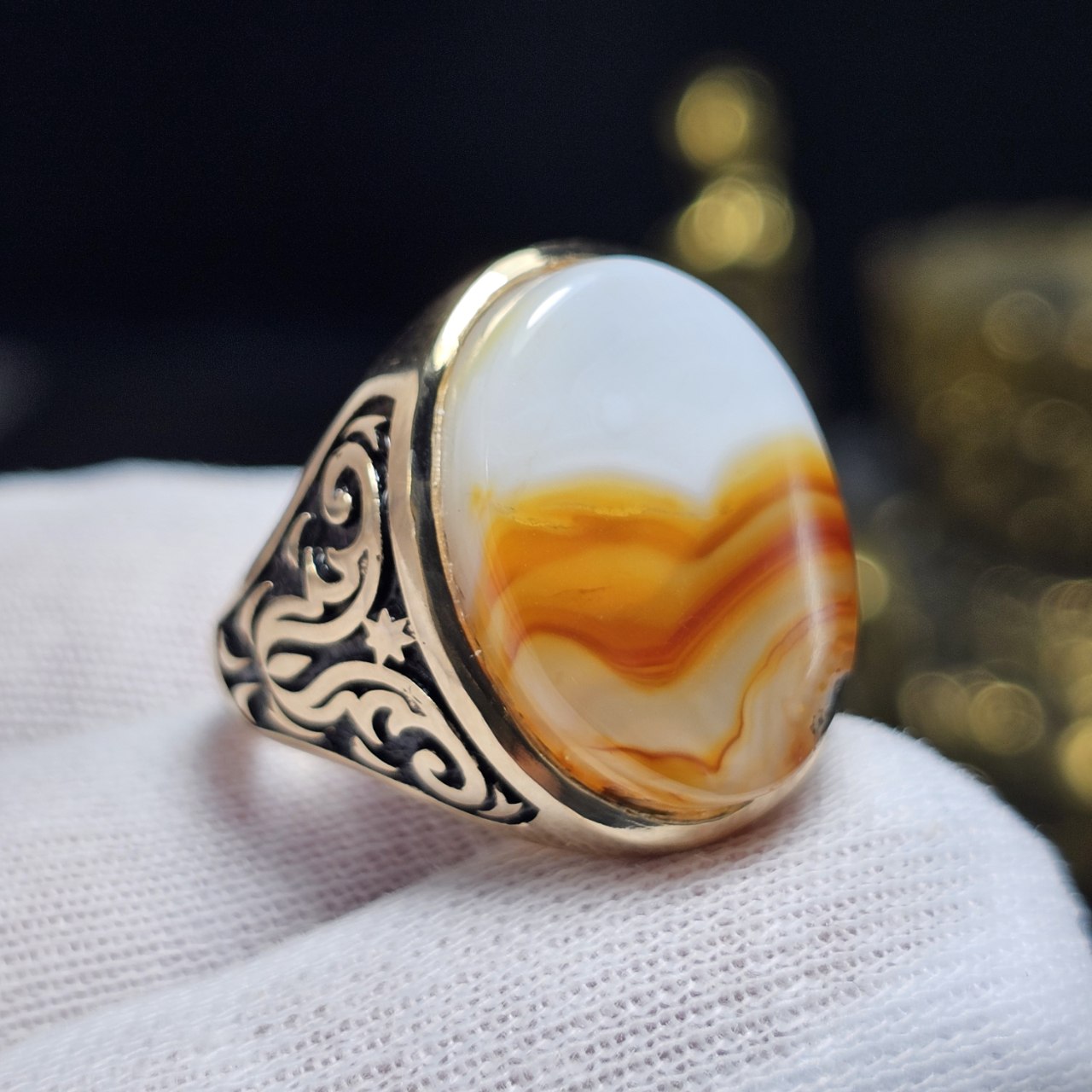انگشتر طلا  روس با سنگ عقیق جزع معدنی خط دست کد : 36546