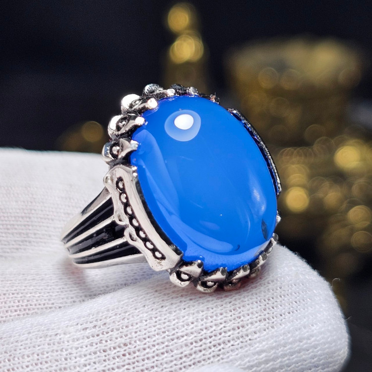 انگشتر نقره روس با سنگ عقیق آبی معدنی